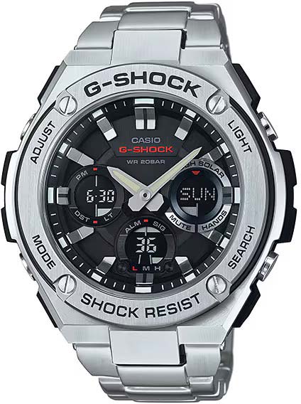 Мужские кварцевые часы. Центральные часовая, минутная и секундная стрелки. Индикация даты и дня недели в малых циферблатах. Фазы Луны. Черный циферблат. Корпус и браслет из нержавеющей стали. Размер корпуса 44,5 х 34 х 9,3 мм. Прочное минеральное стекло устойчивое к мелким механическим повреждениям. Водостойкость WR 50 (мытье рук, дождь). Вес примерно 116 г.