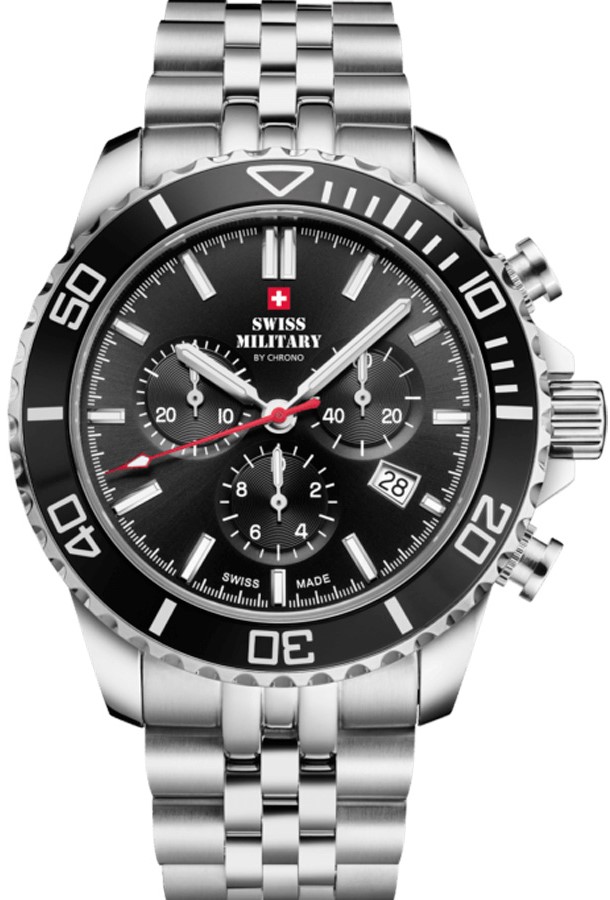 Мужские кварцевые часы. Калибр механизма Ronda 763. Центральные часовая, минутная и секундная стрелки. Апертура даты в позиции 3 часов. Черный циферблат. Арабская индикация времени. 12/24х часовой формат времени. Стрелки с люминесцентным покрытием. Корпус и браслет из нержавеющей стали. Диаметр корпуса 40 мм, толщина 8,9 мм. Устойчивое к возникновению царапин сапфировое стекло. Водостойкость WR 100 (плавание без погружения).