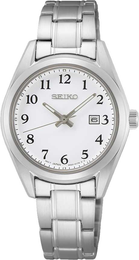 Женские кварцевые часы. Калибр механизма 6N22. Апертура даты в позиции 3 часов. Белый циферблат. Арабская индикация времени. Корпус и браслет из нержавеющей стали. Диаметр корпуса 29,8 мм, толщина 8,3 мм. Устойчивое к возникновению царапин сапфировое стекло. Водостойкость WR 100 (плавание без погружения). Вес примерно 60 гр.