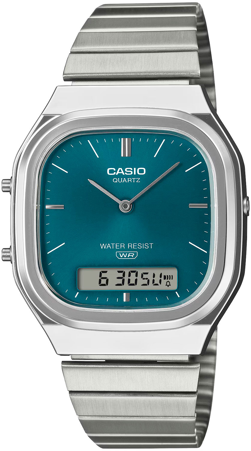 Мужские кварцевые часы. Аналогово-цифровой циферблат. Центральные часовая и минутная стрелки. Двойное время. Одновременное отображение текущего времени в двух разных часовых поясах. Секундомер с точностью показаний 1/100 секунды. Будильник. Автоматический календарь. Корпус с закругленными углами выполнен из серебристого полимерного материала. Размер корпуса 35,8 х 40,8 х 8 мм. Стальной браслет, раскладывающаяся застежка. Акриловое стекло. Водостойкость WR 30 (брызги).